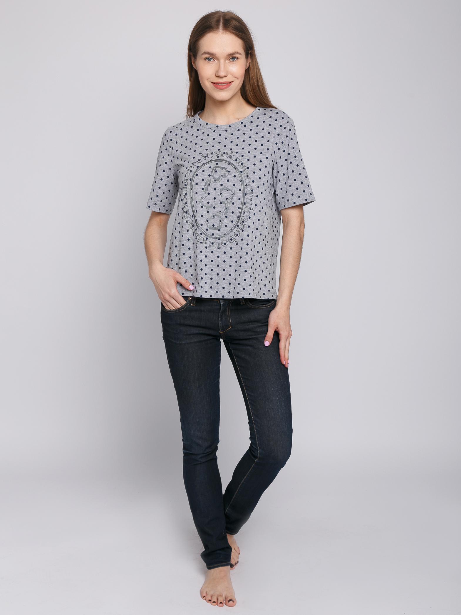 Стильная и модная классическая футболка с принтом спереди - идеальный выбор для создания яркого образа. Рисунок на сером цвете и короткий удлиненный рукав из натуральных тканей делают эту модель универсальной и удобной в носке. Приталенный силуэт с вырезом по горловине превосходит женственность и сочетается с широкими нижними предметами гардероба.